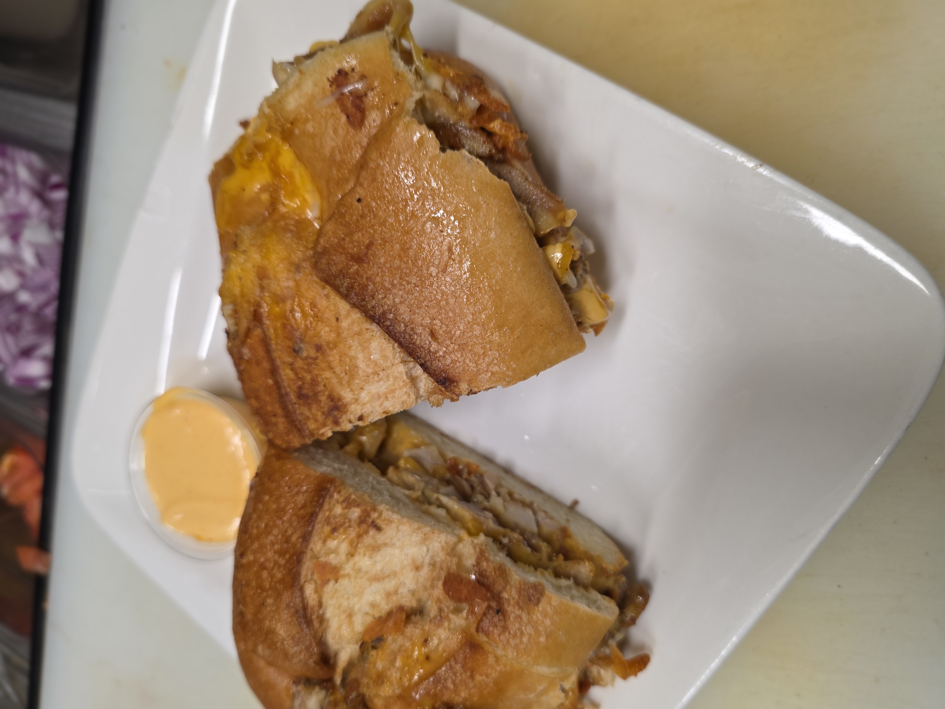 Thinly sliced chicken shawarma served in a soft bun with our creamy special sauce, melted cheddar cheese, and cucumber pickles.