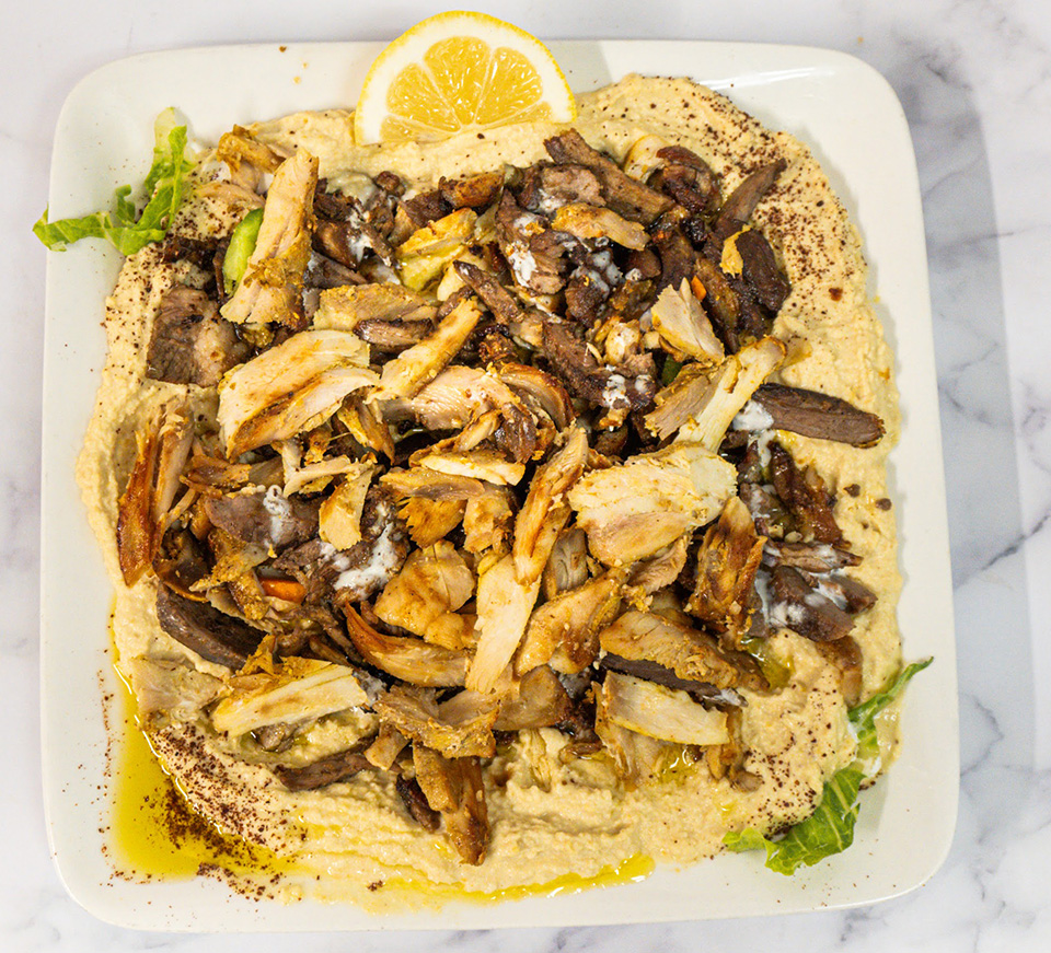 Topped with our traditional tahini sauce, pomegranate molasses, cheddar cheese, and hot sauce upon request.