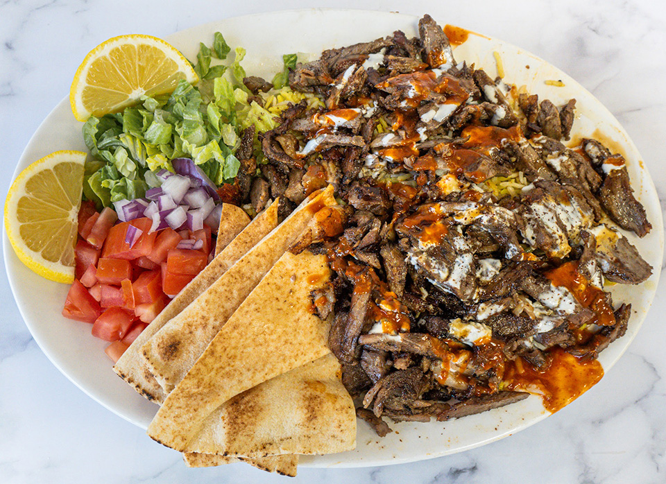 Grilled Signature Beef Blend shawarma served with saffron basmati rice, sliced pita bread, and our traditional tahini sauce, garlic toum sauce, and pomegranate molasses. Hot sauce upon request.