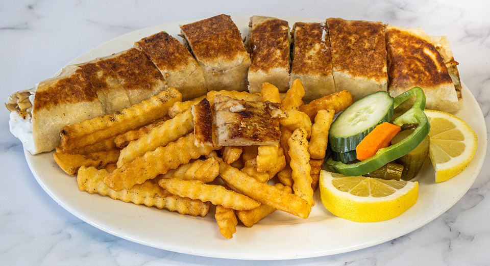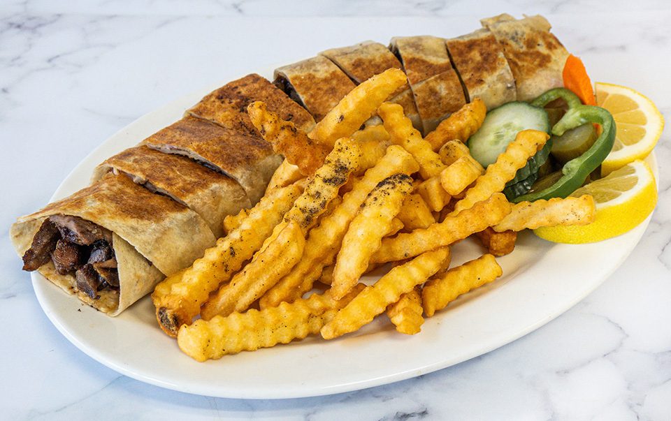 4 Signature Beef Blend Sarookh wraps cut into bite-sized pieces, served with a side salad, French fries, and our traditional tahini sauce. Hot sauce upon request.