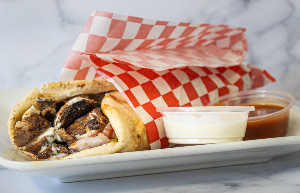 Thinly sliced Signature Beef Blend shawarma served in Lebanese-style pita with onions, tomatoes, pickles, and our traditional tahini sauce. Comes with a side of garlic toum sauce. Hot sauce upon request.