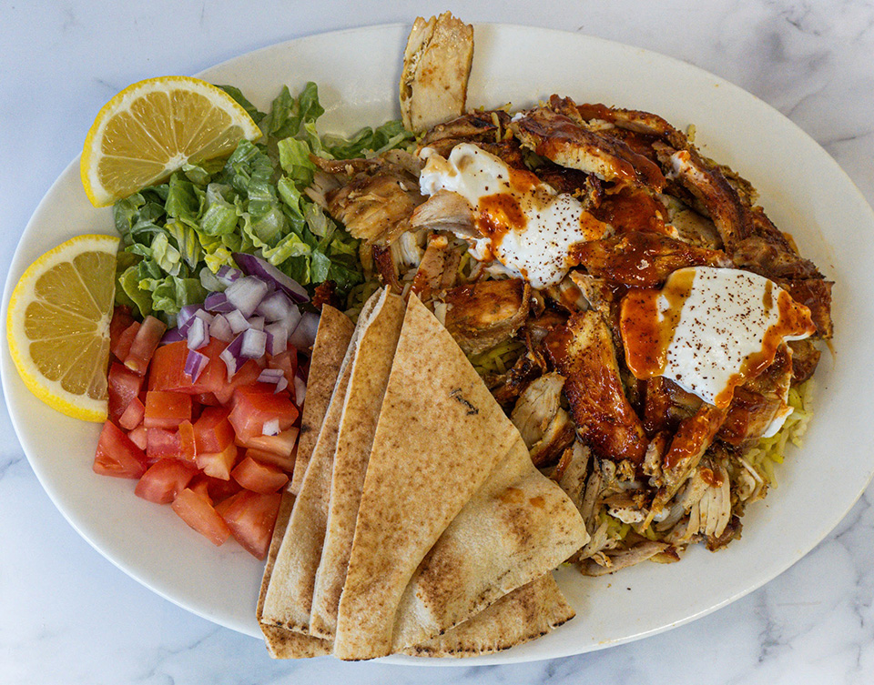 Thinly sliced grilled chicken shawarma served with saffron basmati rice, sliced pita bread, lettuce, tomatoes, and your choice of toppings. Comes with garlic toum sauce. Hot sauce upon request.