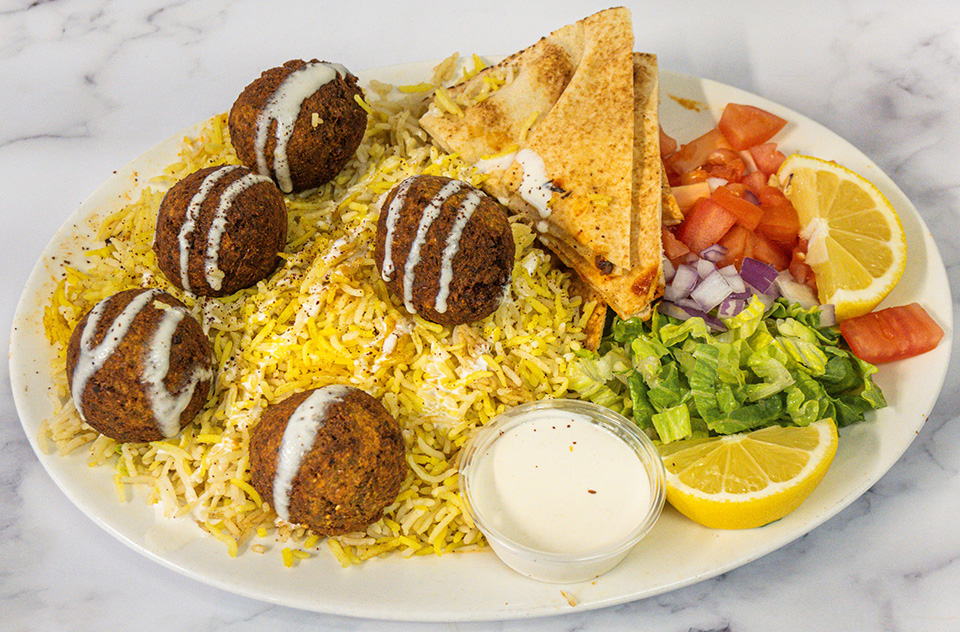 Our signature falafel served with saffron basmati rice, creamy hummus, fresh salad, and warm pita bread. Hot sauce upon request.