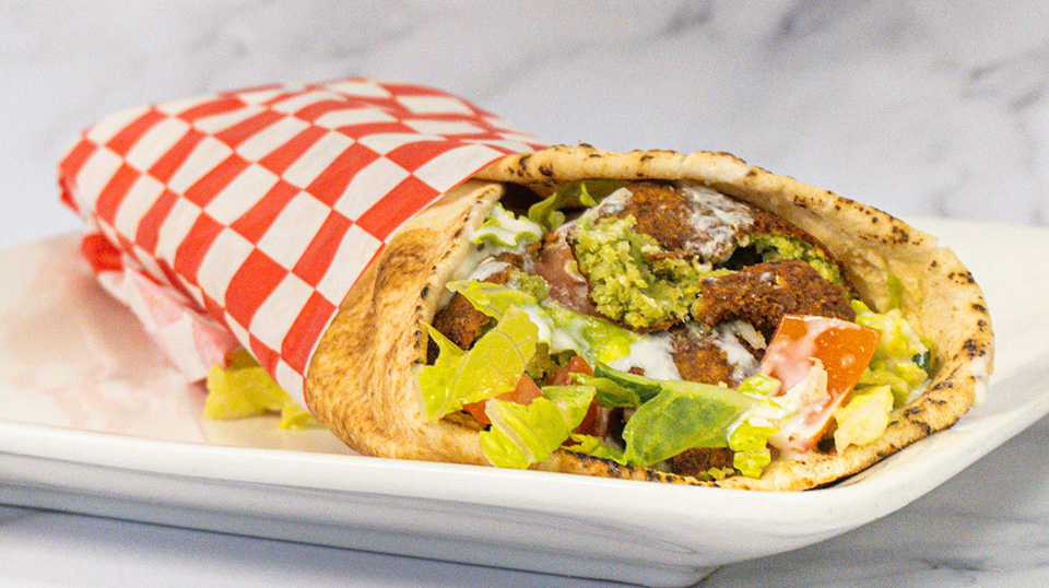Golden falafel patties wrapped in warm pita bread with creamy hummus, fresh tomatoes, crisp lettuce, and tahini sauce. Hot sauce upon request.