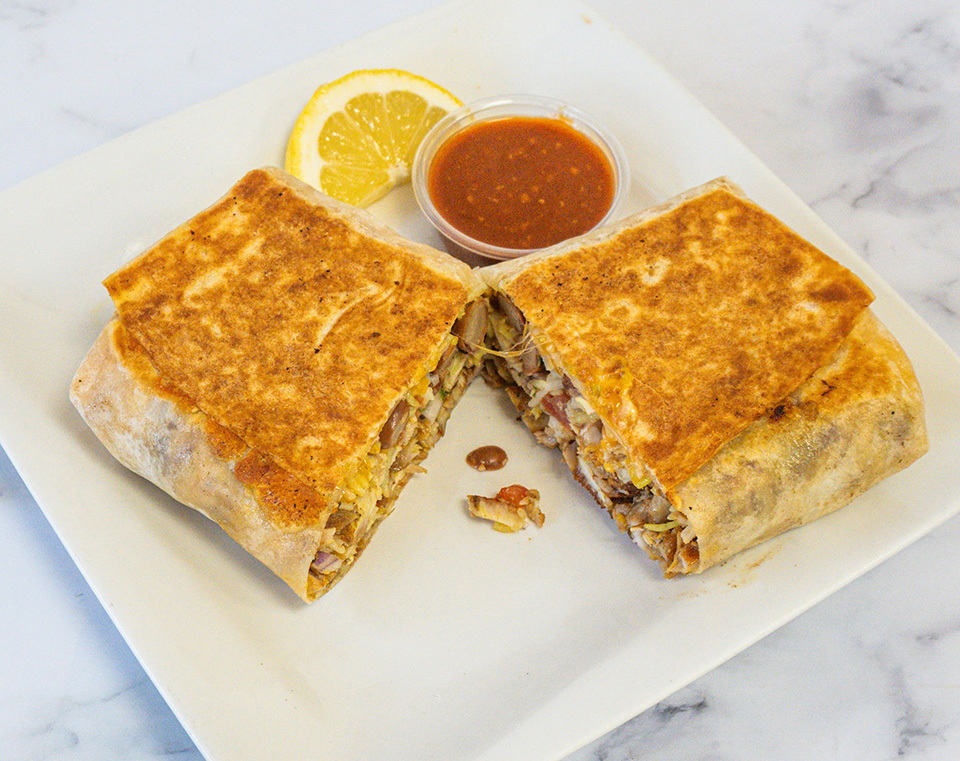 Thinly sliced chicken served in tortilla bread with our traditional garlic toum sauce and cucumber pickles. Hot sauce upon request.