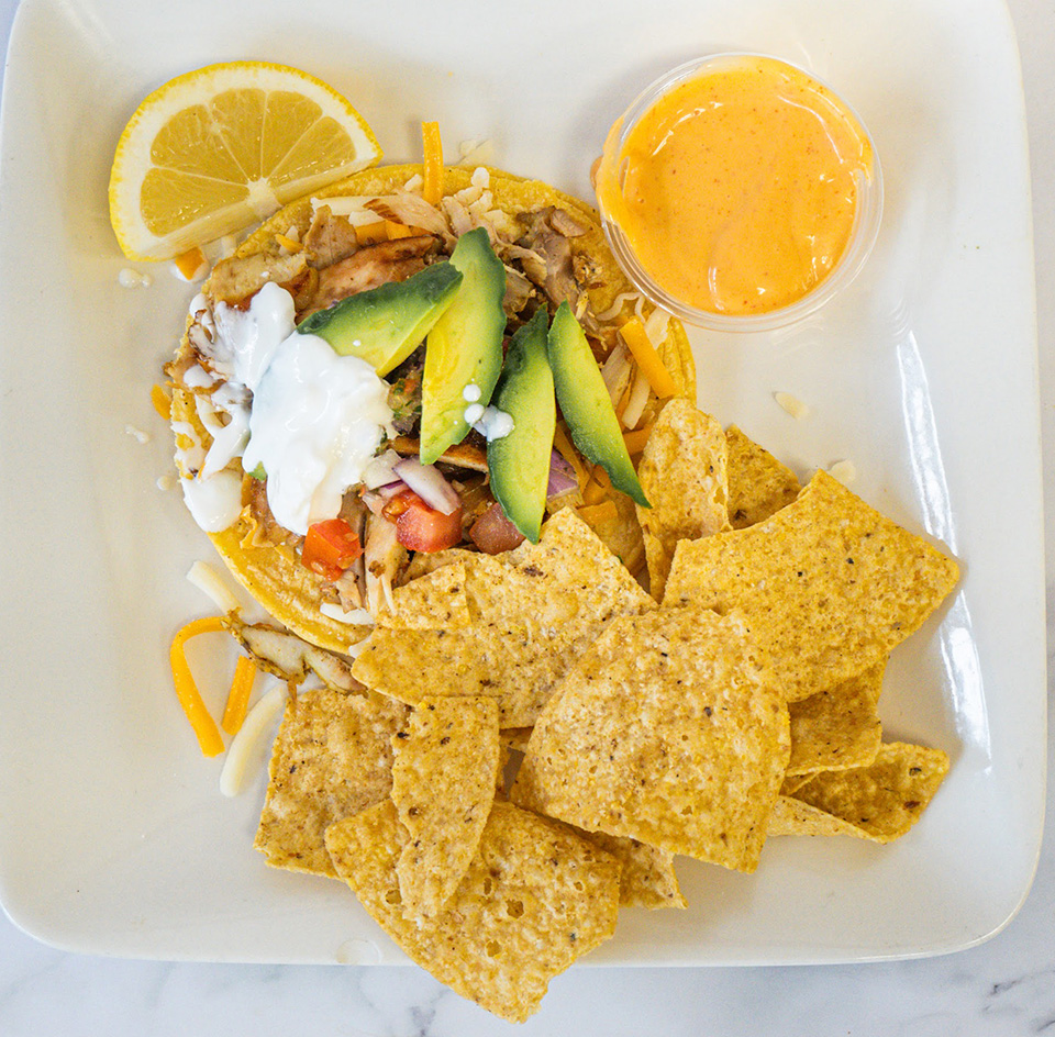 Grilled tortilla stuffed with chicken or Signature Beef Blend, cheddar cheese, onions, tomatoes, and spicy mayo. Super includes avocado, sour cream, and chips. Hot sauce upon request.