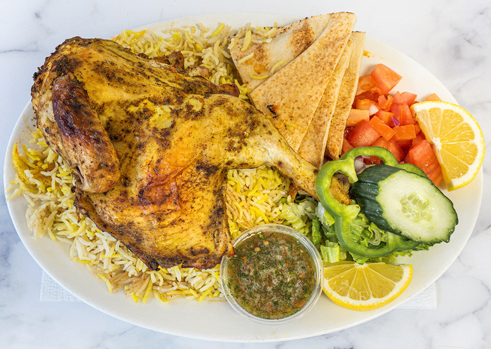 Our signature oven-roasted Yemeni-style chicken served with saffron basmati rice, fresh salad, and Fresh Yemeni Salsa — a bold blend of tomato, cilantro, garlic, onion, and lemon.