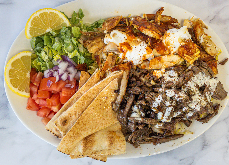 Combination of chicken and Signature Beef Blend shawarma served with saffron basmati rice, sliced pita bread, lettuce, tomatoes, and your choice of toppings. Comes with garlic toum sauce, tahini sauce, and Azmi Sauce. Hot sauce upon request.