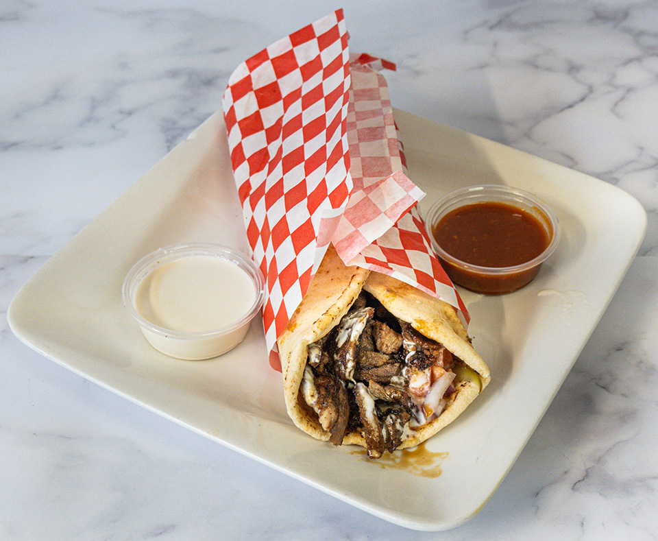 Thinly sliced Signature Beef Blend shawarma served in tortilla bread with onions, tomatoes, pickles, sumac, and pomegranate molasses, topped with our traditional tahini sauce. Served with a side of garlic toum sauce. Hot sauce upon request.